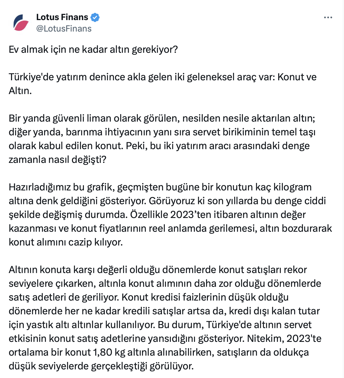 Ekonomi ve finans dünyası ile ilgili olarak yaptığı incelemelerle dikkat çeken Lotus Finans, resmi X hesabı üzerinden bu kez de ev almak için ne kadar altın gerektiğini açıkladı.