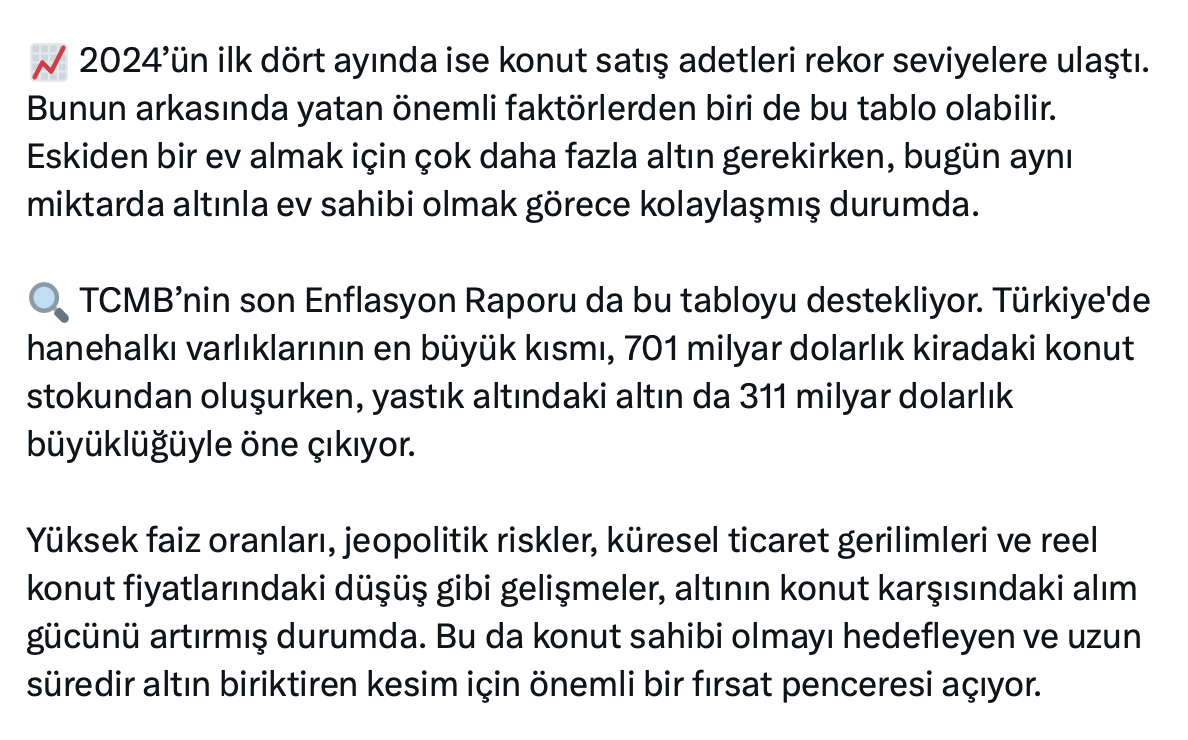 2024’ün ilk dört ayında ise konut satış adetleri rekor seviyelere ulaştı. Bunun arkasında yatan önemli faktörlerden biri de bu tablo olabilir. Eskiden bir ev almak için çok daha fazla altın gerekirken, bugün aynı miktarda altınla ev sahibi olmak görece kolaylaşmış durumda.