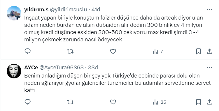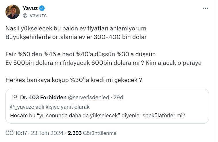 Yavuz paylaşımında "Büyükşehirlerde ortalama evler 300-400 bin dolar. Faiz yüzde 50'den yüzde 45'e hadi yüzde 40'a düşsün yüzde 30'a düşsün. Ev 500 bin dolara mı fırlayacak 600 bin dolara mı? Kim alacak o paraya? Herkes bankaya koşup yüzde 30'la kredi mi çekecek?" ifadelerini kullandı.
