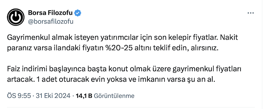 Borsa Filozofu resmi sosyal medya hesabı https://x.com/borsafilozofu üzerinden yaptığı paylaşımda gayrimenkul almak isteyen yatırımcılar için son kelepir fiyatlar olduğunu söyledi.