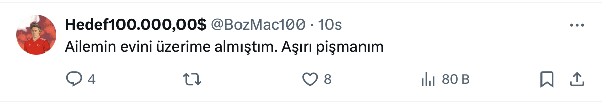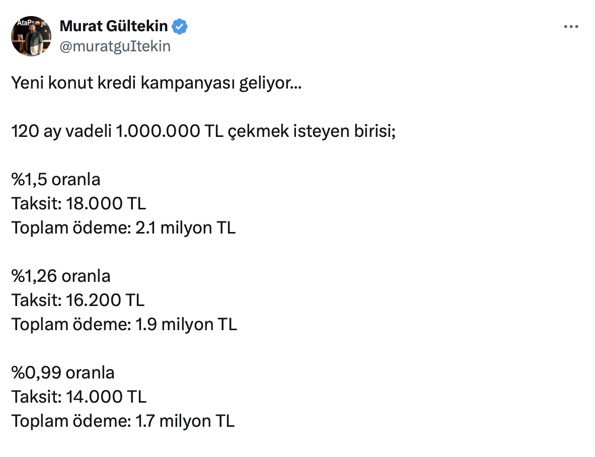 Murat Gültekin paylaşımında, 120 ay vadeli 1.000.000 TL çekmek isteyen birinin yüzde 1,5 oranla aylık 18 bin TL taksit ödeyeceğini belirtti.