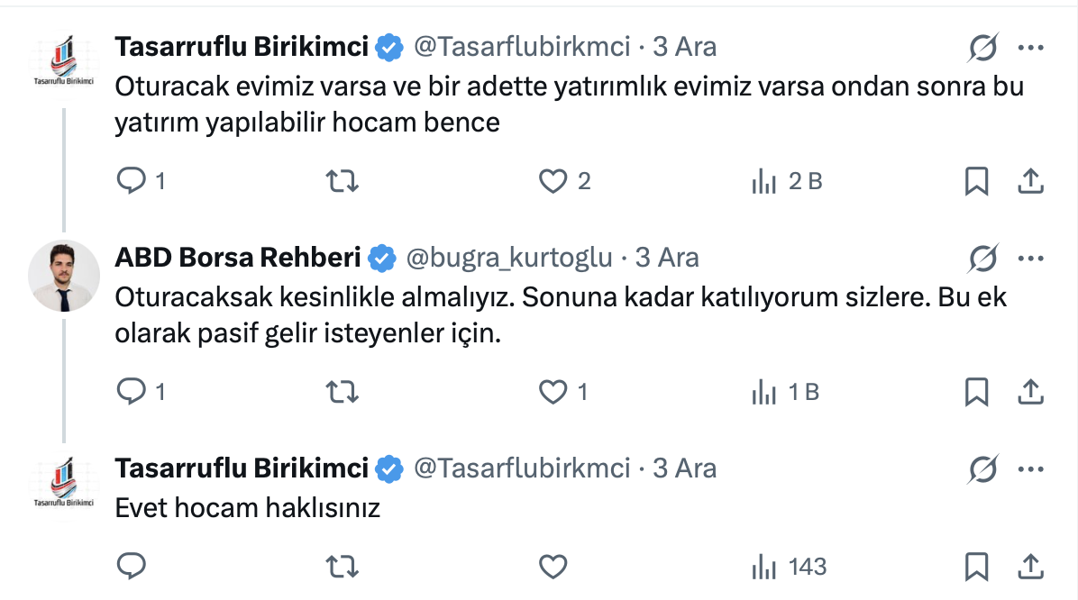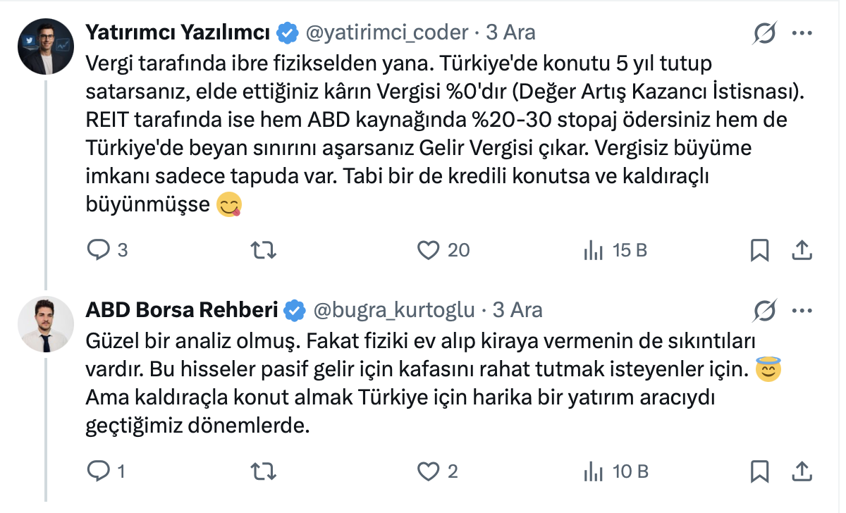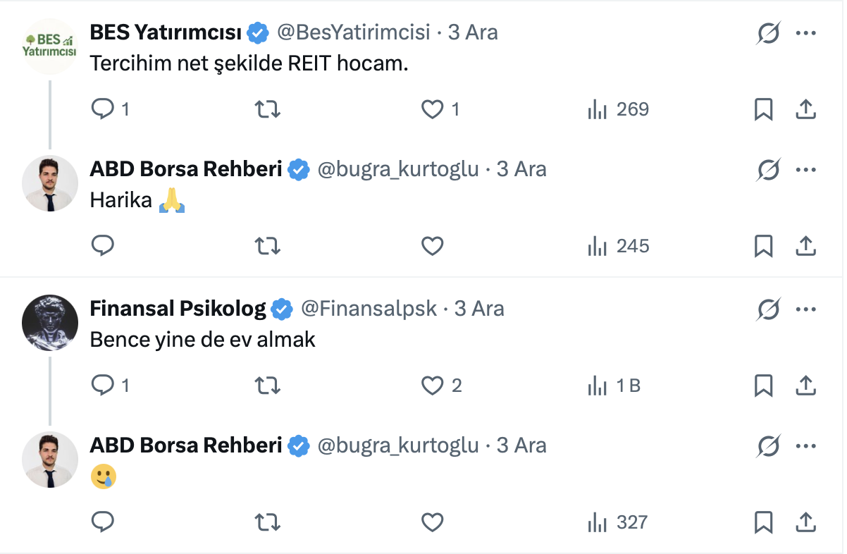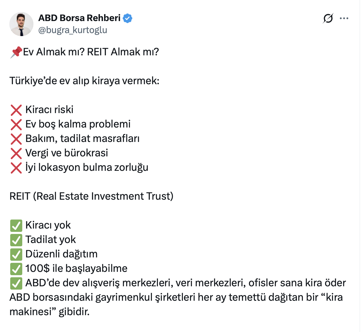 ABD Borsa Rehberi X hesabı https://x.com/bugra_kurtoglu üzerinden yaptığı paylaşımda Ev almak mı? REIT almak mı? Sorusuna yanıt vererek, artıları ve eksileri sıraladı.