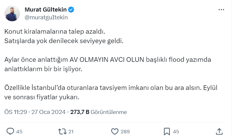 Resmi sosyal medya hesabı https://twitter.com/muratguItekin üzerinden kiralık konut piyasası ile ilgili bir paylaşım yapan Gayrimenkul Uzmanı Murat Gültekin, konut kiralamalarına talebin azaldığını belirtti.