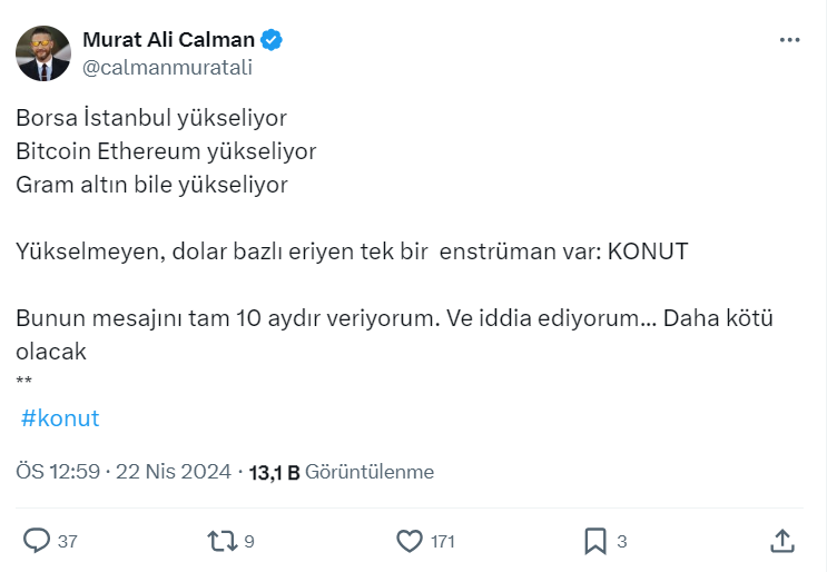 Paylaşımında Borsa İstanbul yükseliyor, Bitcoin, Ethereum yükseliyor, gram altın bile yükseliyor" diyen Murat Ali Calman, "Yükselmeyen, dolar bazlı eriyen tek bir enstrüman var: Konut" ifadelerini kullandı.