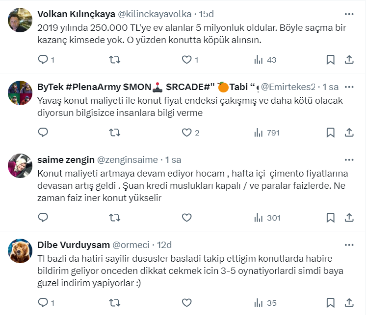 Ekonomistlerden ve sektör temsilcilerinden konut fiyatları ile ilgili çarpıcı yorumlar peş peşe gelirken, Kripto fenomeni Murat Ali Calman da resmi X hesabı https://twitter.com/calmanmuratali üzerinden konut fiyatları ile ilgili bir paylaşım yaptı.