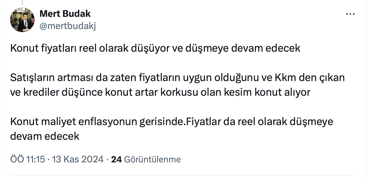 8 aydır düşüş eğiliminde olan konut fiyatları gündemden düşmezken, Girişimci Mert Budak da resmi sosyal medya hesabı üzerinden yaptığı paylaşımda konut fiyatlarının reel olarak düşmeye devam edeceğini belirtti.