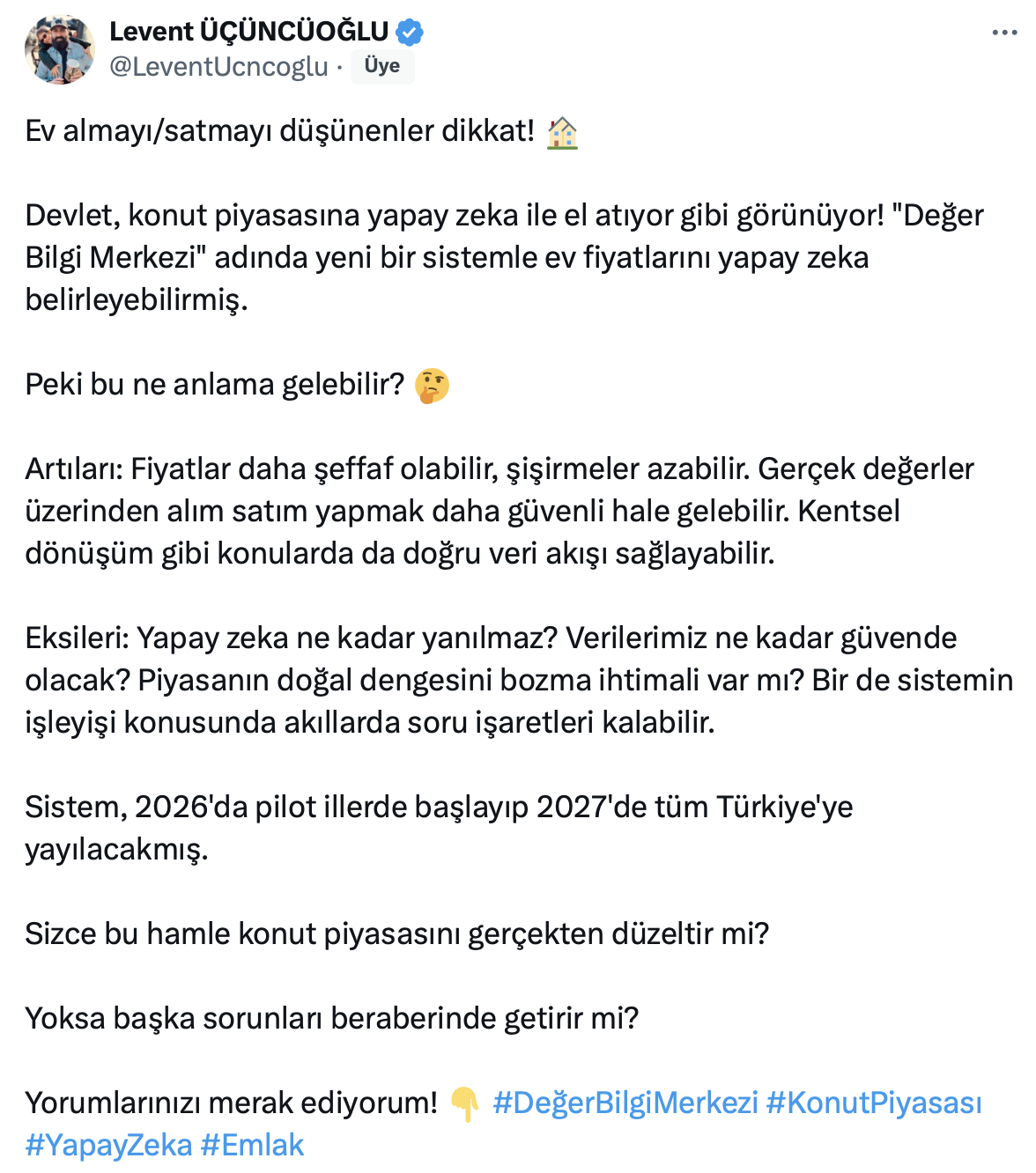 Levent Üçüncüoğlu paylaşımında "Değer Bilgi Merkezi" adında yeni bir sistemle ev fiyatlarını yapay zekanın belirleyebileceğini belirterek, bunun ne anlama geldiğini açıkladı.