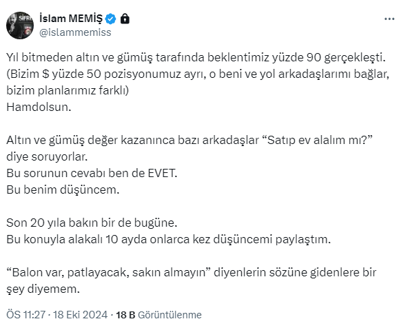 Öte yandan, yatırımcıların en çok merak ettiği '' Altın ve gümüş değer kazanınca satıp ev alalalım mı?'' sorusuna net şekilde 'EVET' yanıtını verdi.