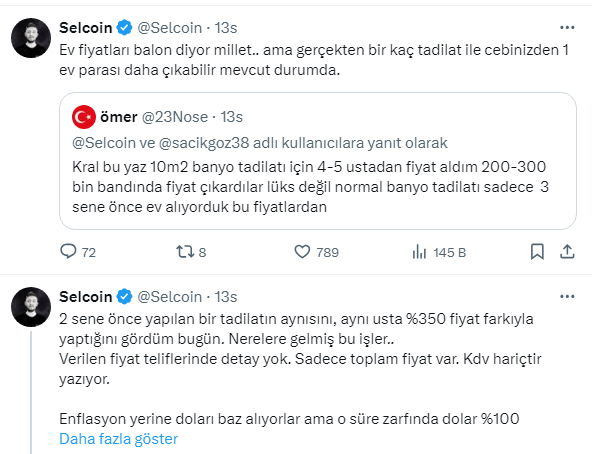 Evini yenilemek isteyenlerin neredeyse bir 'ev parası' tutarında ödedikleri işçilik ve malzeme fiyatları çileden çıkarttı. Piyasa Analisti Selçuk Ergin (Selcoin) sosyal medya hesabından yaptığı paylaşımla işçilik ve malzeme fiyatlarındaki gerçek tabloyu ortaya çıkardı.