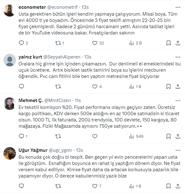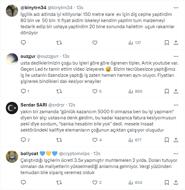 Ergin sosyal medya hesabı X'ten işçilik ve malzeme fiyatlarındaki gerçek tabloyu ortaya çıkararak önerilerde bulundu. İşte Ergin'in sosyal medya hesabından yaptığı o paylaşım ve gelen yorumlar...