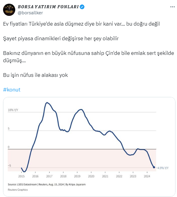 Borsa Yatırım Fonları, sosyal medya hesabından, Türkiye'deki konut fiyatlarını değerlendirdi. Türkiye'de ev fiyatları asla düşmez diye br algı olduğunu belirten uzman isim, bunun doğru olmadığını söyledi. Konut fiyatlarının gerileyeceğini belirten Borsa Yatırım Fonları, piyasada dinamiklerin değişmesi halinde herşeyin değişebileceğine dikkat çekti. İşte Borsa Yatırım Fonları'nın sosyal medya hesabı X'ten yaptığı o paylaşım...