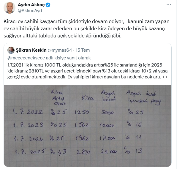 Boğaziçi Üniversitesi Politika ve İşletme mezunu Aydın Akkoç, sosyal medya hesabından kiracı ve ev sahibi kavgalarının devam ettiğini bir örnekle açıkladı.