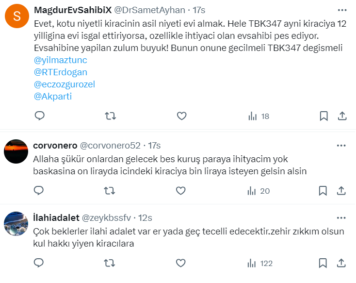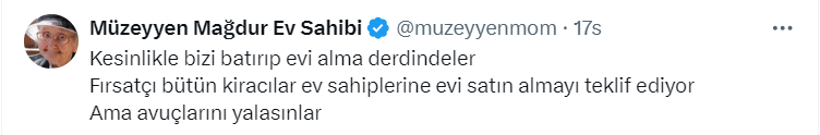 Mağdur ev sahibi X hesabı https://twitter.com/muzeyyenmom üzerinden yaptığı paylaşımda üzerinden yaptığı paylaşımda paylaşımda fırsatçı kiracıların ev sahiplerine evi satın almayı teklif ettiğini söyledi.