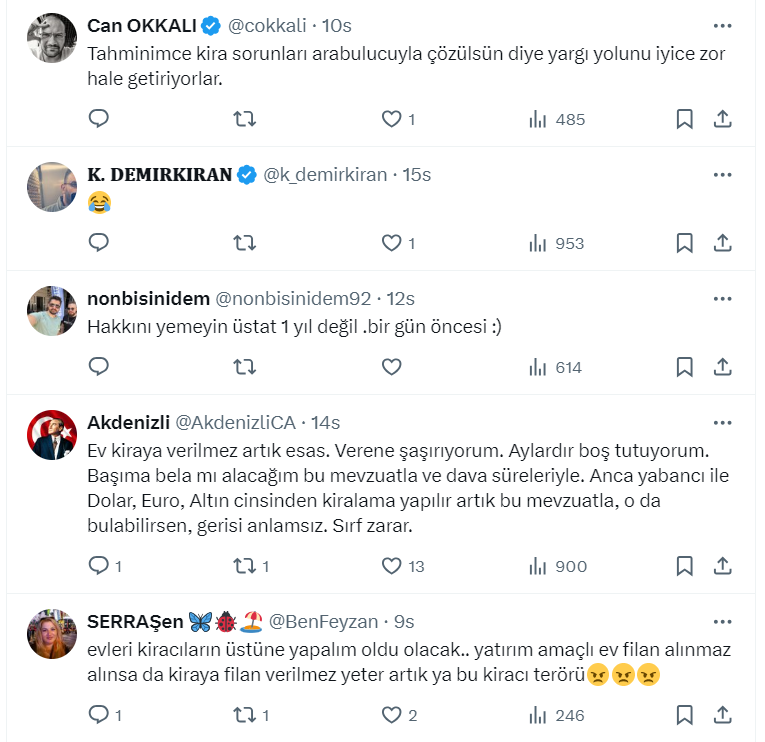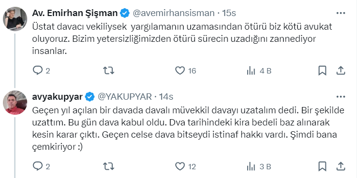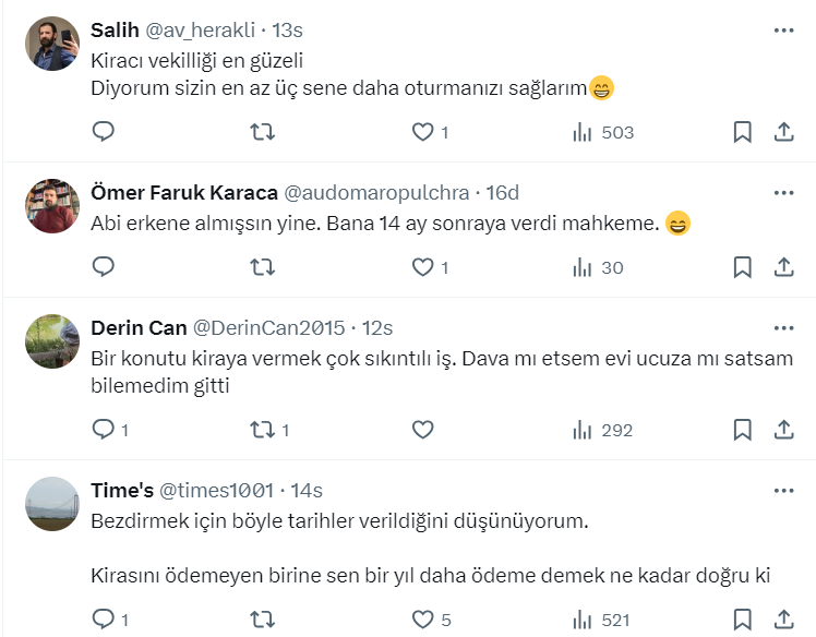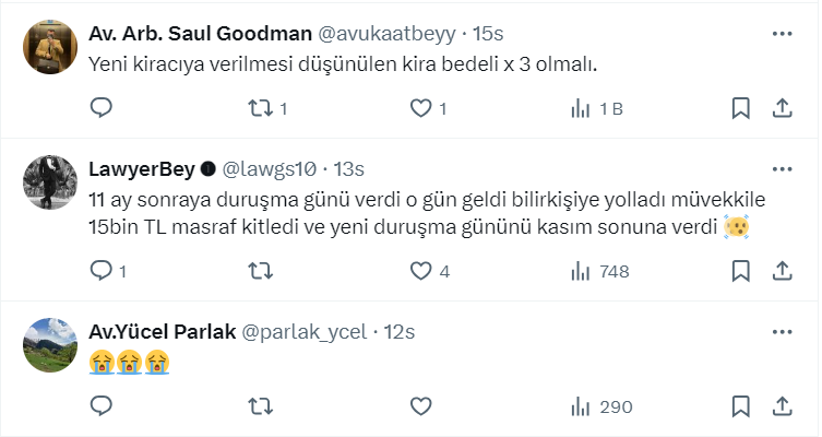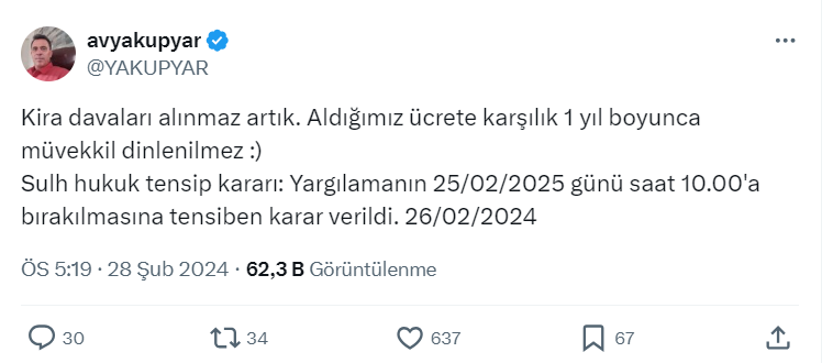 Avukat Yakup Yar resmi X hesabı https://twitter.com/YAKUPYAR üzerinden yaptığı paylaşımda "Kira davaları alınmaz artık. Aldığımız ücrete karşılık 1 yıl boyunca müvekkil dinlenilmez :) müvekkil dinlenilmez" ifadelerini kullandı.