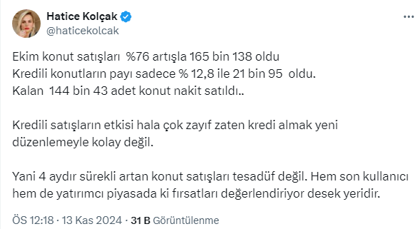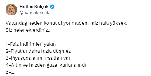 TÜİK tarafından açıklanan konut satışı rakamlarını sosyal meyda hesabından değerlendiren Ekonomist Hatce Kolçak, vatandaşların konuta yönelmesindeki 4 ana nedeni açıkladı.