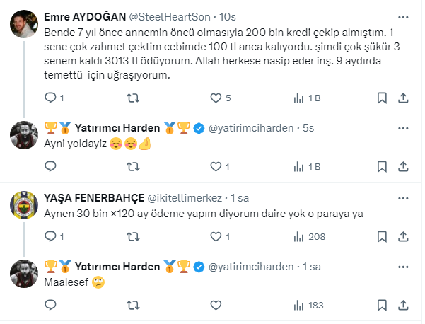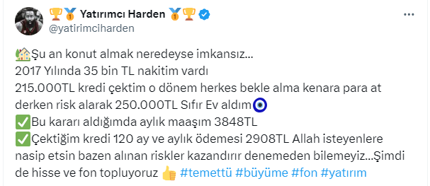 Bazı dönemlerde ev sahibi olmak için risk almak gerektiğini söyleyen Yatırımcı Harden https://x.com/yatirimciharden X sosyal medya hesabından yaptığı paylaşımda şu an konut almanın neredeyse imkansız olduğunu belirtti. 2017 yılında riske girerek satın aldığı ev için şu an 2 bin 908 TL aylık ödeme yaptığını söyledi. Yatırımcı Harden, risk olsa da oturmak için ev alınması gerektiğini ifade etti.