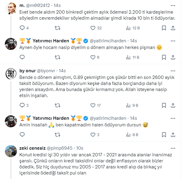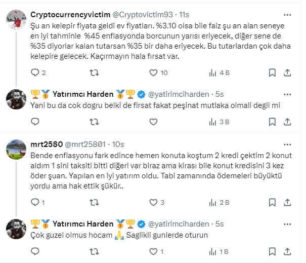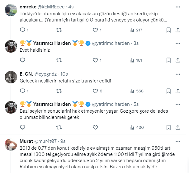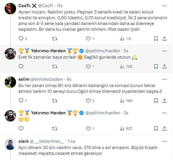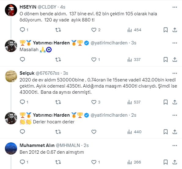 Güncel faizlerle ev alınmasının mümkün olmadığını söyleyen takipçileri de 2005-2017 yılları arasında düşük faizlerle ev alanların çok şanslı olduğunu söyledi.