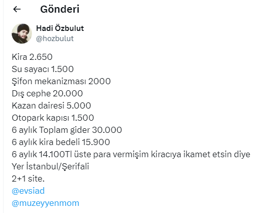 Şerifali'de ev sahibi mağduru Hadi Özbulut sosyal medya hesabından, kiracılı evine yaptığı masrafları kalem kalem yazdı. Ortaya çıkan toplam gider ise görenleri şaşkına çevirdi. İşte o masrafların olduğu paylaşım ve takipçilerden gelen yorumlar...