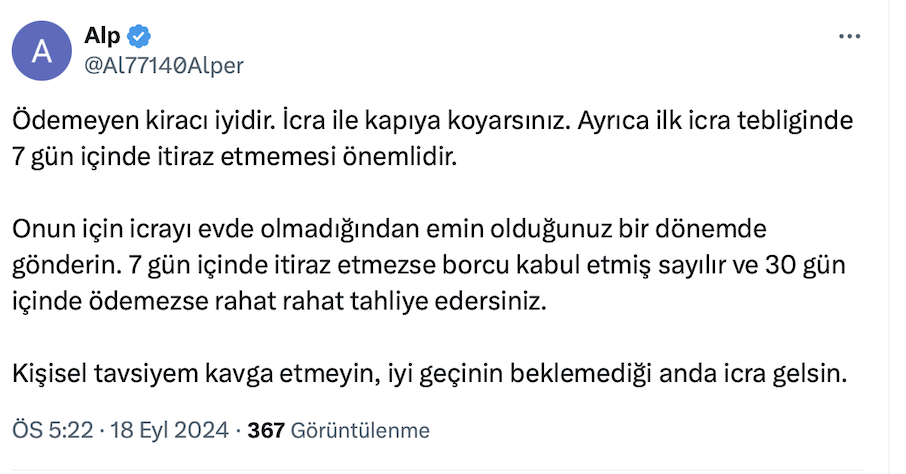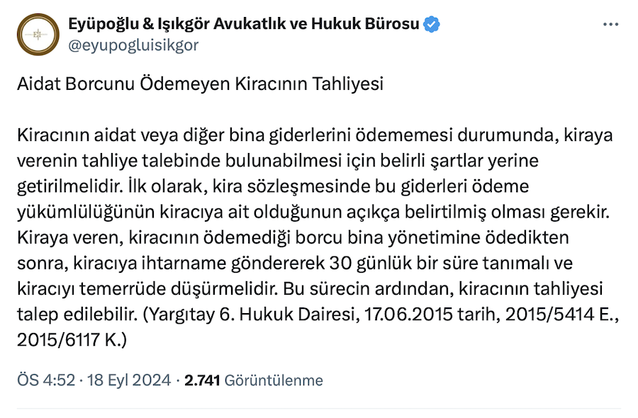 Hem ev sahipleri hem de kiracı hakları ile ilgili olarak yaptığı paylaşımlarla dikkat çeken Eyüpoğlu - Işıkgör Avukatlık ve Hukuk Bürosu resmi sosyal medya hesabı https://x.com/eyupogluisikgor üzerinden yaptığı paylaşımda aidat borcunu ödemeyen kiracının nasıl tahliye edileceğini açıkladı.