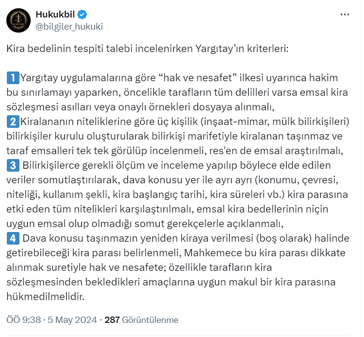 Sosyal medya hesabı üzerinden yaptığı ev sahibi ve kiracı hakları paylaşımları ile dikkat çeken Hukukbil isimli kullanıcı resmi sosyal medya hesabı https://twitter.com/bilgiler_hukuki üzerinden kira bedelinin tespiti talebi incelenirken Yargıtay’ın kriterlerini yazdı.