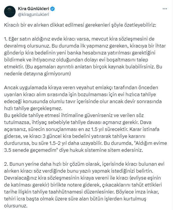 Kira günlükleri, sosyal medya hesabından kiracılı ev alırken dikkat edilmesi gerekenleri maddeler halinde sıraladı.