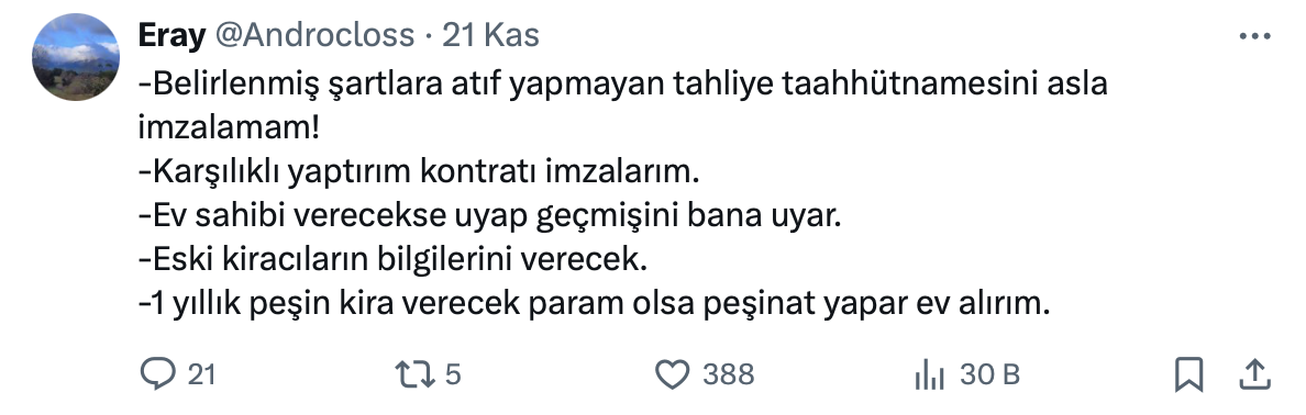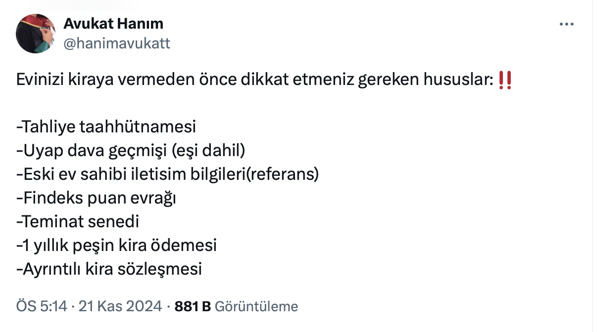 47,6 bin takipçili Avukat Hanım resmi sosyal medya hesabı https://x.com/hanimavukatt üzerinden evinizi kiraya vermeden önce dikkat etmeniz gereken hususları paylaştı.
