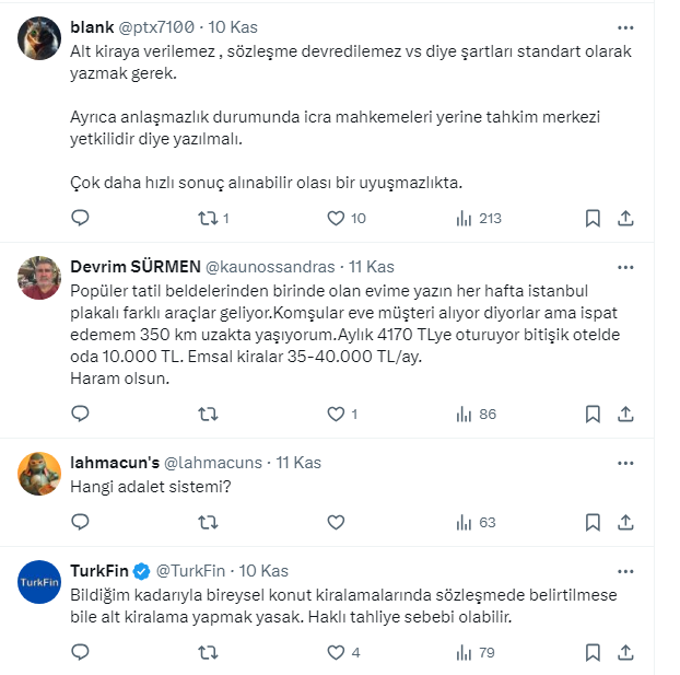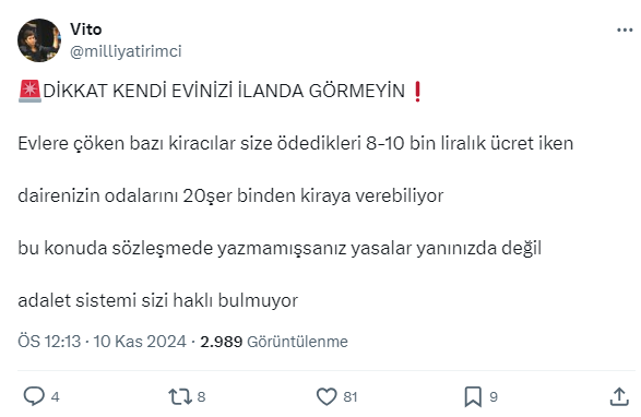 Milliyatırımcı isimli twitter kullanıcısı evlere çöken bazı kiracıların 8-10 bin liralık ücrete kiraladıkları evleri 20 bin liraya oda oda kiraladığını söyledi.