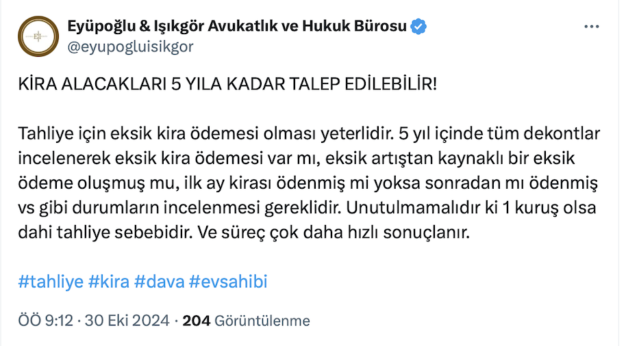 Eyüpoğlu - Işıkgör Avukatlık ve Hukuk Bürosu resmi sosyal medya hesabı üzerinden yaptığı paylaşımda kira alacaklarının 5 yıla kadar talep edilebileceğini belirtti.