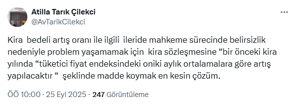 Çilekci, kira sözleşmesine “bir önceki kira yılında “tüketici fiyat endeksindeki oniki aylık ortalamalara göre artış yapılacaktır “ şeklinde madde koymanın en kesin çözüm olduğunu belirtti.