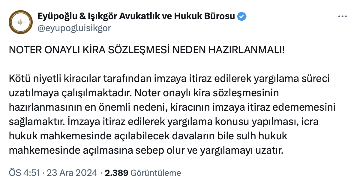Eyüpoğlu - Işıkgör Avukatlık ve Hukuk Bürosu sosyal medya hesabı üzerinden yaptığı paylaşımda noter onaylı kira sözleşmesinin hazırlanmasının en önemli nedeninin kiracının imzaya itiraz edememesini sağlamak olduğunu belirtti.
