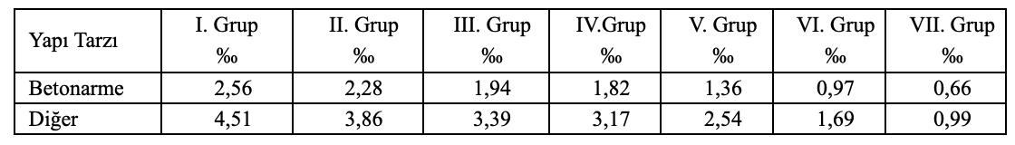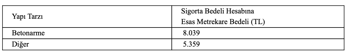 MADDE 1- 31/12/2016 tarihli ve 29935 üçüncü mükerrer sayılı Resmî Gazete’de yayımlanan Zorunlu Deprem Sigortası Tarife ve Talimat Tebliğinin 2 nci maddesinin birinci fıkrasının ikinci cümlesi ve aynı fıkrada yer alan tablo aşağıdaki şekilde değiştirilmiştir.