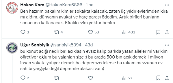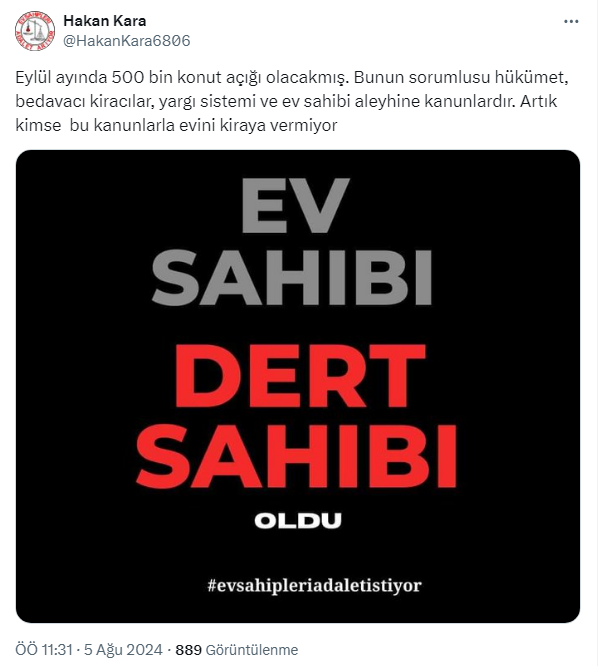 Mağdur ev sahibi Hakan Kara sosyal medya hesabı X'ten 'eylülde 500 bin konut açığı olacakmış'' diyerek bunun sorumlularının hükümet, bedavacı kiracılar, yargı sistemi ve ev sahibi aleyhine kanunlar olduğunu söyledi. İşte Kara'nın sosyal medyadan paylaştığı o paylaşım ve gelen yorumlar...