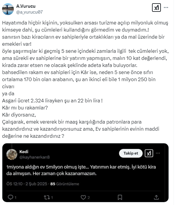 Mağdur ev sahibi A. Vurucu, kiralardan zarar eden ev sahiplerinin sesi olarak şu ifadeleri kullandı: ''5 sene içindeki zamlarla ilgili tek cümleleri yok, ama sürekli ev sahiplerine bir yatırım yapmışsın, malın 10 kat değerlendi, kirada zarar etsen ne olacak şeklinde adeta kafa buluyorlar.'' diyerek sitem etti. A. Vurucu, bahsedilen rakamın ev sahipleri için kar olarak görenlere şu soruyu sordu ''Neden 5 sene önce sıfırı ortalama 170 bin olan arabanın, şu an ikinci eli bile 1 milyon 250 bin civarı?''
