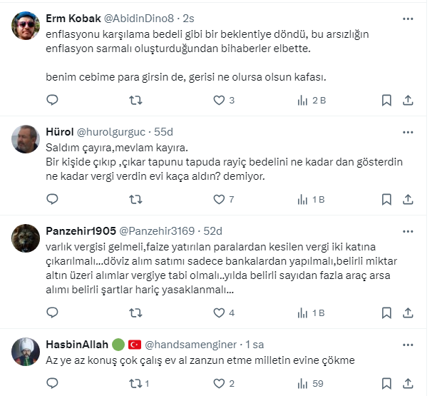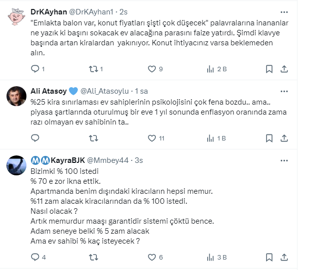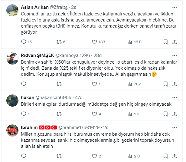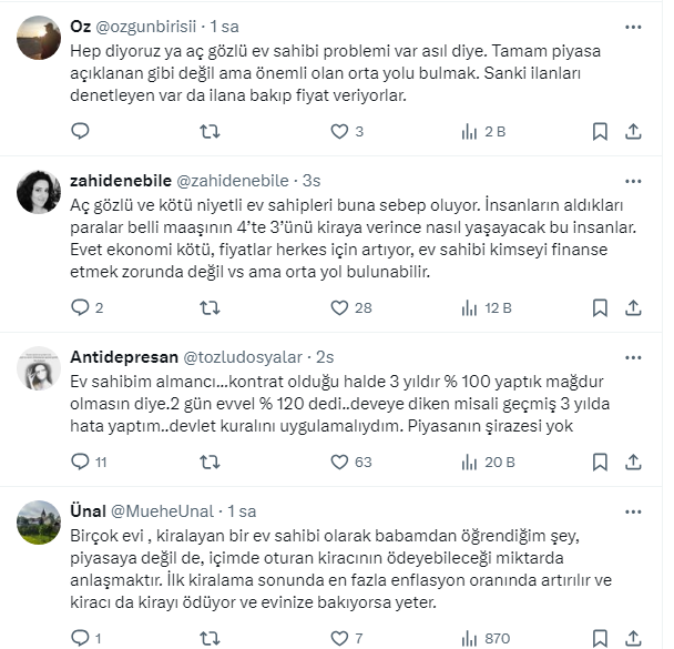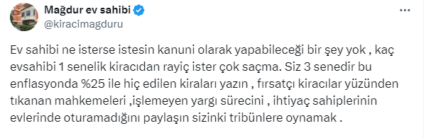 Tolga Aykut paylaşımında; “Ev sahipleri de iyice çoştular. Kiracı daha geçen sene evi 40.000 TL’ye tutmuş, bu senede de 2025 Ocak ayı kira artış oranı nispetinde %58,5 olarak kirasını arttırıyor ama ev sahibi o bölgede benzer özellikte evlerde ilan sitelerinde güncel kira bedeli 80.000 TL diye, kiranın en az 75.000 TL yapılmasını istiyor. Yahu ev kiraları, ilan sitelerinde talep edilen rakamlara göre belirlenmez. Üstelik her sene de güncel kira bu diye artış istenmez. İyice şaşırdılar” dedi.