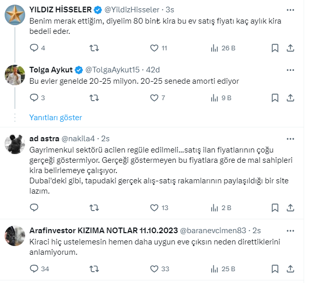 Gayrimenkul yatırım uzmanı ve ekonomist Tolga Aykut, konut fiyatlarını ev sahiplerinin yükselttiğini belirterek, https://x.com/TolgaAykut15 X sosyal medya hesabından yaptığı paylaşımda evini 1 yıl önce kiraya veren ev sahiplerinin bile rayiç bedelleri örnek göstererek yüzde yüze yakın zam istediğini belirterek, ev sahiplerinin iyice coştuğunu, şaşırdiğini söyledi.