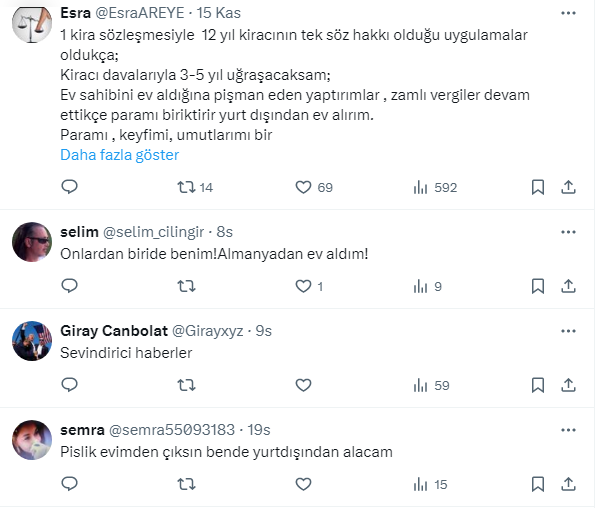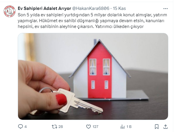 Son 5 yılda ev sahipleri yurtdışından 5 milyar dolarlık konut almışlar, yatırım yapmışlar. Hükümet ev sahibi düşmanlığı yapmaya devam etsin, kanunları hepsini, ev sahibinin aleyhine çıkarsın. Yatırımcı ülkeden çıkıyor