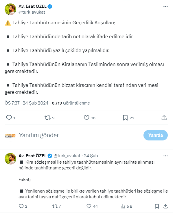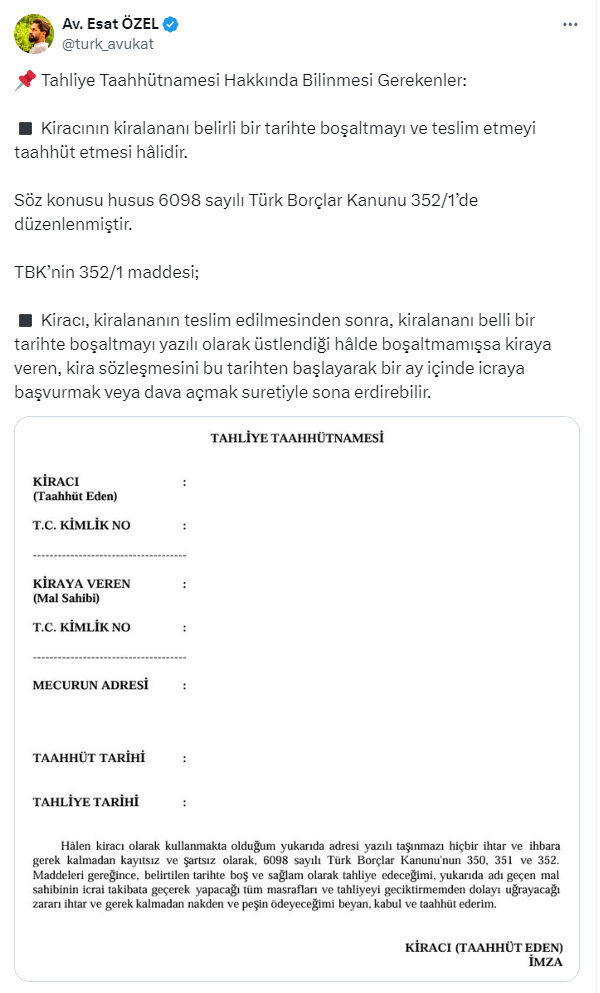 Avukat Esat Özel resmi X hesabı https://twitter.com/turk_avukat üzerinden tahliye taahhütnamesi hakkında tüm bilinmesi gerekenleri paylaştı.