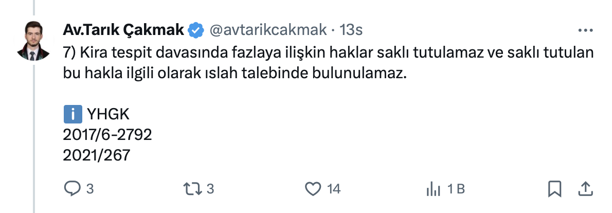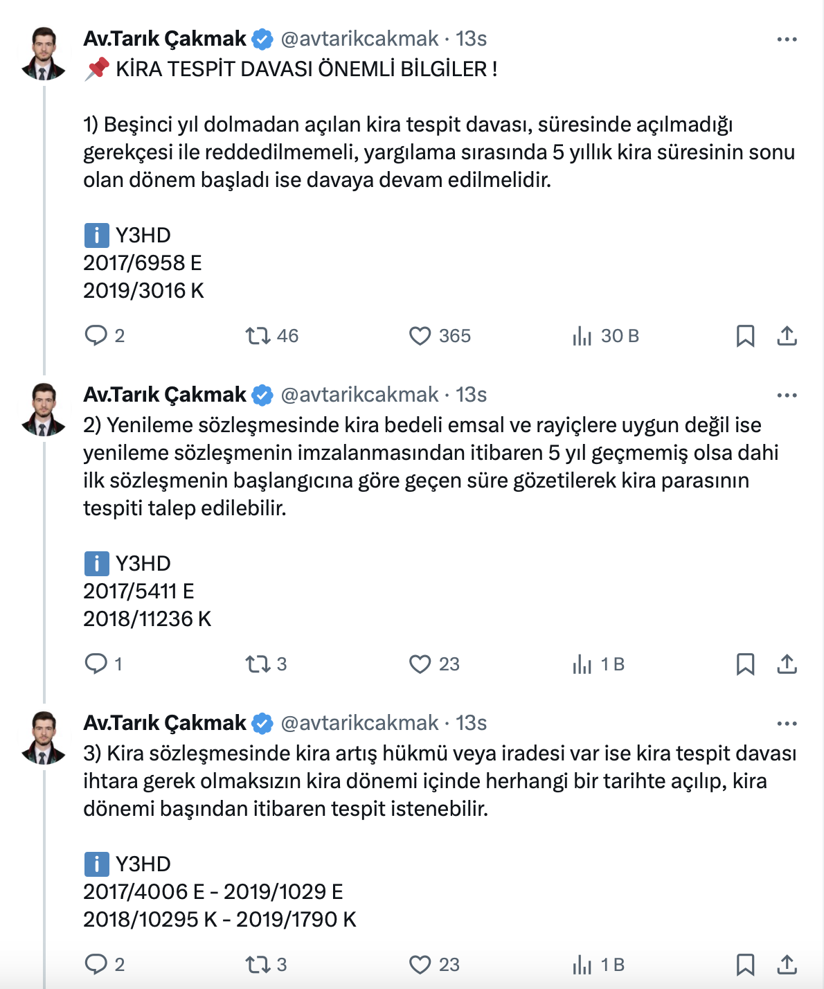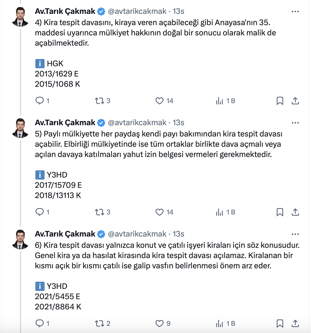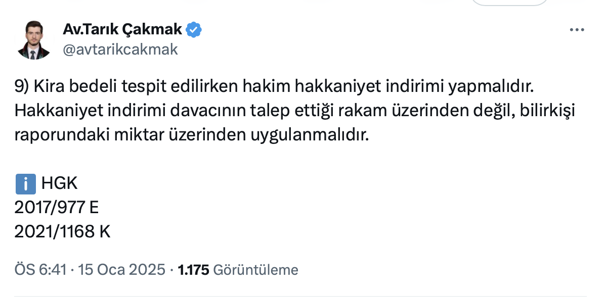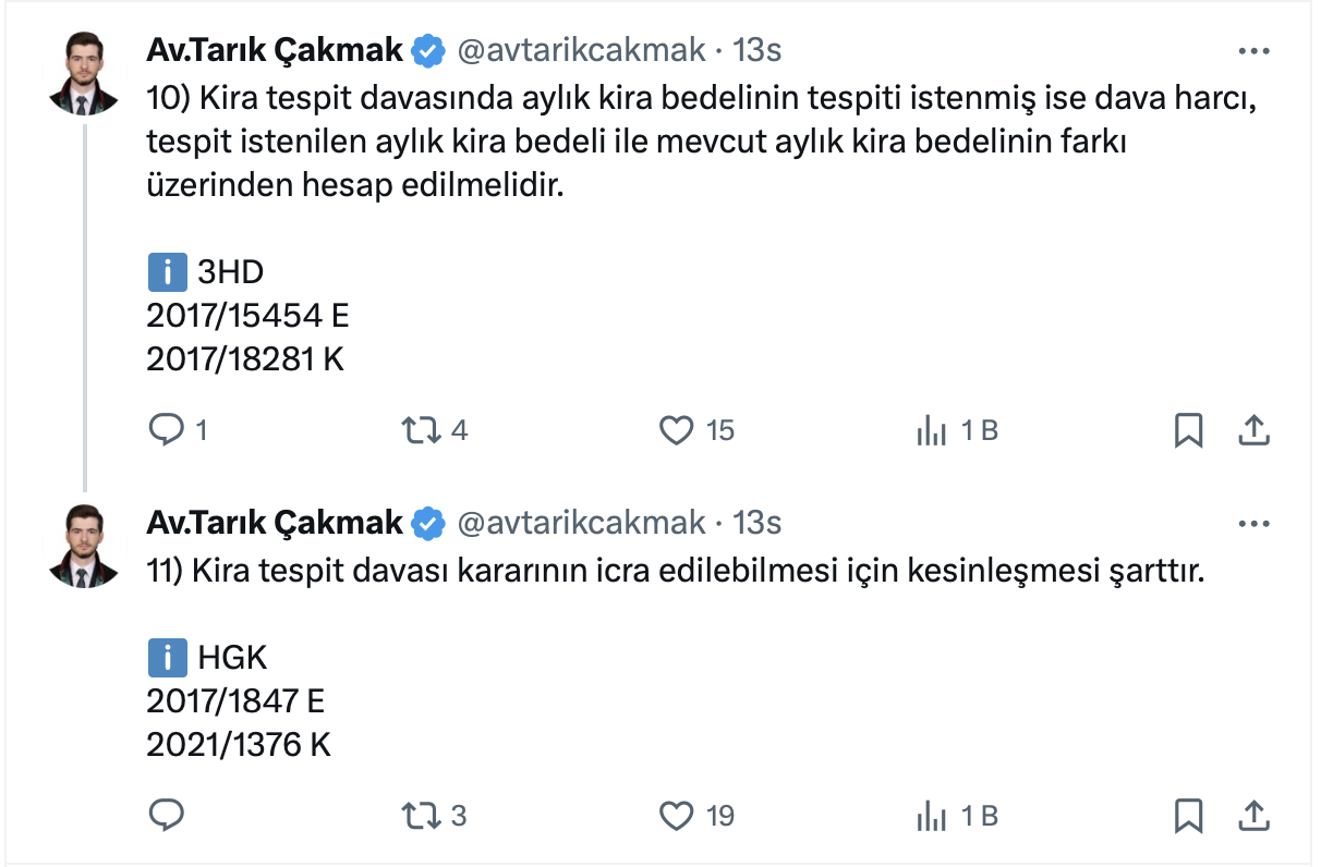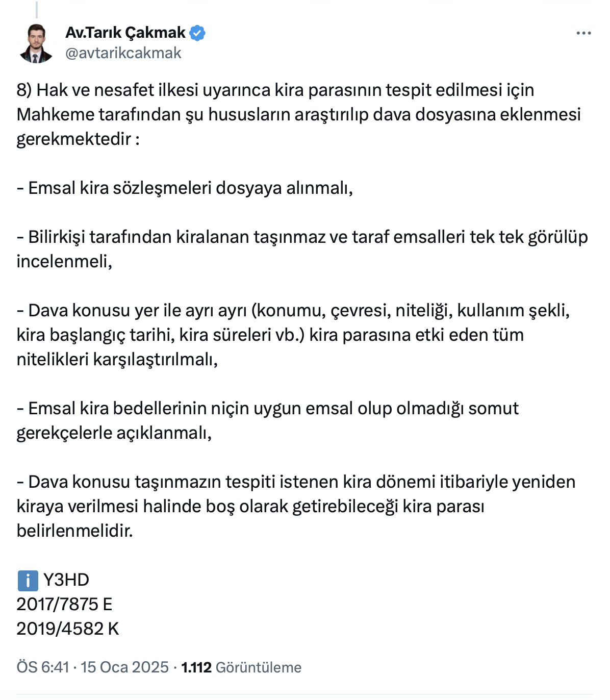 Avukat Tarık Çakmak resmi X hesabı https://x.com/avtarikcakmak üzerinden yaptığı paylaşımda 11 maddede kira tespit davası ile ilgili önemli bilgileri paylaştı.