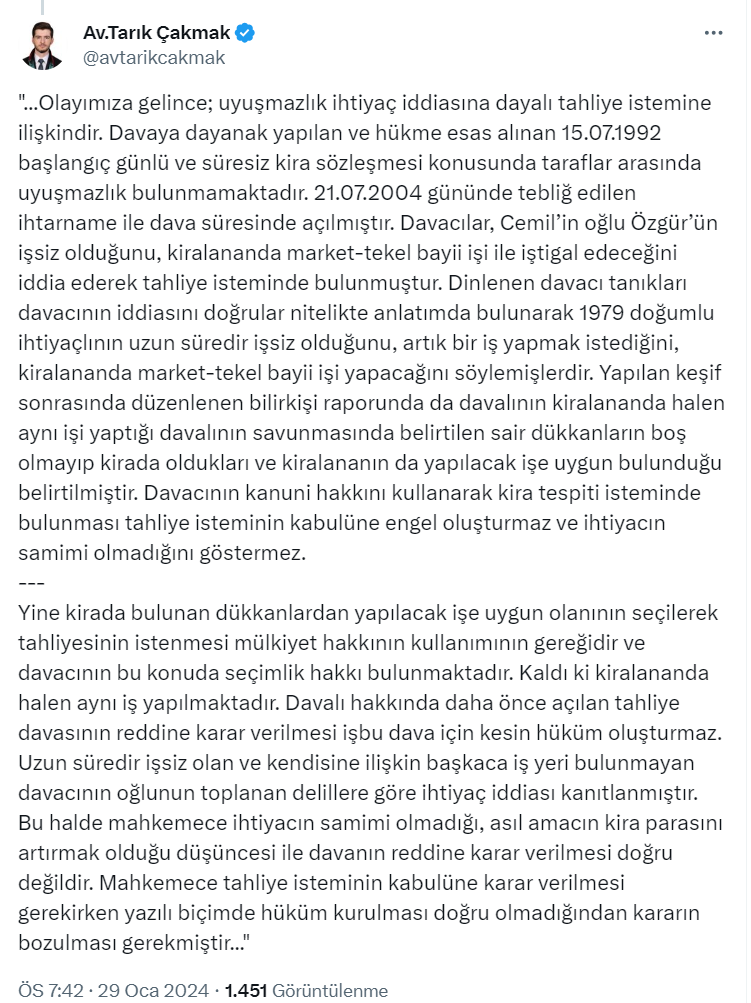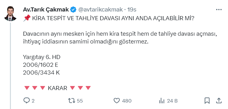 Tarık Çakmak paylaşımında "Davacının aynı mesken için hem kira tespit hem de tahliye davası açması, ihtiyaç iddiasının samimi olmadığını göstermez." ifadelerini kullandı.