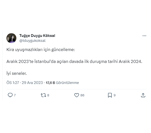 Sosyal Medya hesabı X'ten paylaşım yapan Avukat Tuğçe Köksal'dan kira uyuşmazlıkları ile ilgili son dakika paylaşımı geldi. Kira uyuşmazlıklarında güncellemeye gidildiğini söyleyen Avukat Köksal, ''Kira uyuşmazlıkları için güncelleme'' başlığı altında ayrıntıları açıkladı. Paylaşımın altına takipçilerinden hemen yorumlar gelmeye başladı. İşte o paylaşım ve gelen yorumlar...