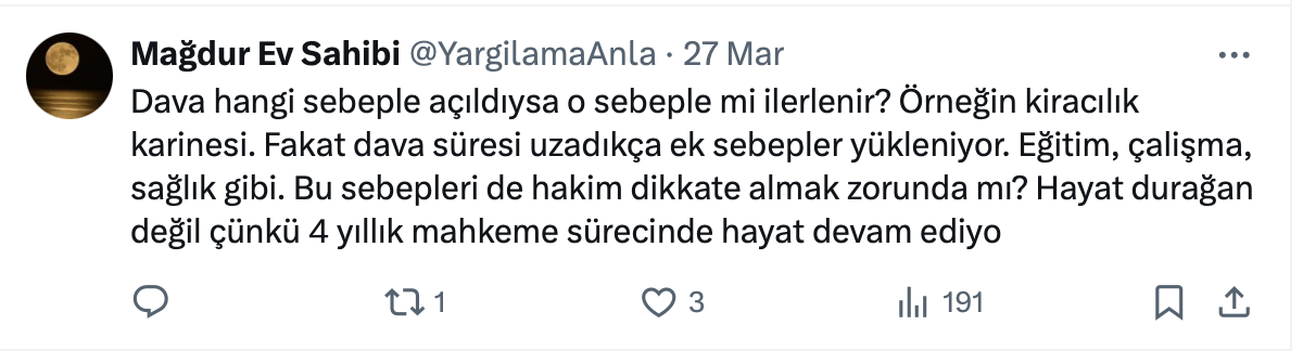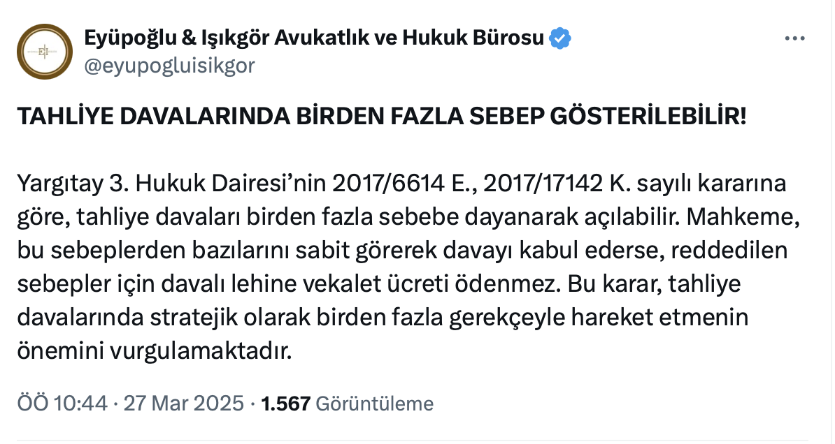 Eyüpoğlu - Işıkgör Avukatlık ve Hukuk Bürosu resmi sosyal medya hesabı https://x.com/eyupogluisikgor üzerinden yaptığı paylaşımda tahliye davalarında birden fazla sebep gösterilebileceğini belirtti.