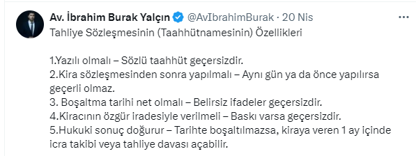 Peki tahliye tahhütnamesinin özellikleri neler? Tahliye taahhütnamesinin geçerli olması için hangi kritiler yer almalı? Avukat İbrahim Burak Yalçın, sosyal medya hesabından milyonlarca ev sahibi ve kiracıyı ilgilendiren tahliye sözleşmesinin özelliklerini 5 maddede açıkladı. İşte o özellikler...