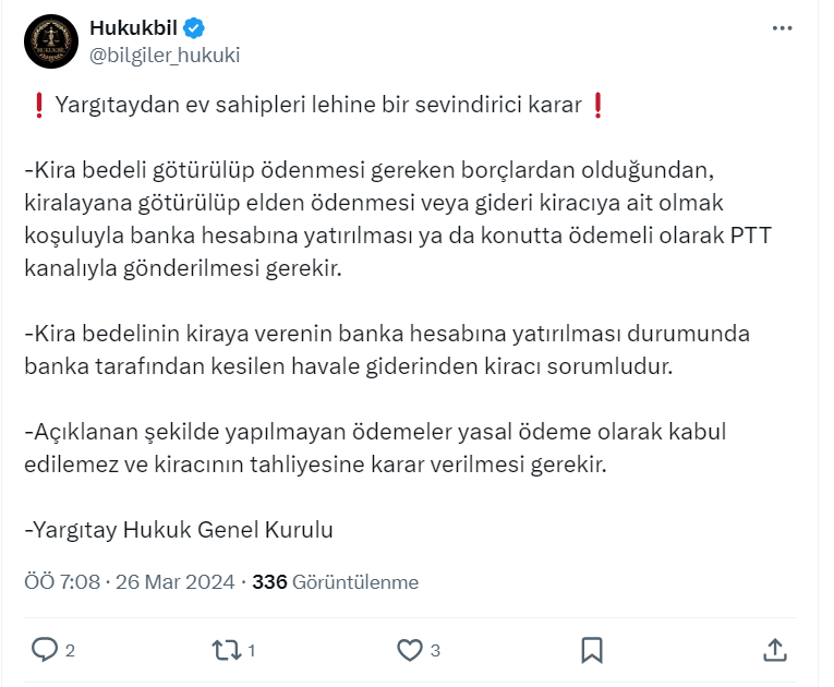 Sosyal medya üzerinden yaptığı paylaşımlarla dikkat çeken 8 bin 200 takipçili Hukukbil isimli kullanıcı resmi sosyal medya hesabı https://twitter.com/bilgiler_hukuki üzerinden yaptığı paylaşımlarla dikkat çeken Hukukbil de Yargıtay'dan ev sahipleri lehine bir sevindirici kararı paylaştı.