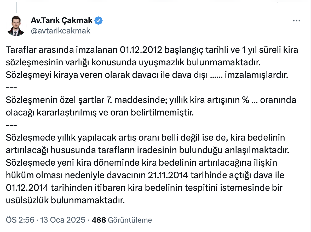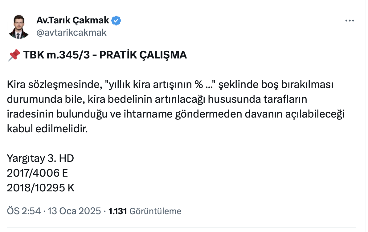 Avukat Tarık Çakmak resmi sosyal medya hesabı üzerinden yaptığı paylaşımda kira sözleşmesinde, "yıllık kira artışının % ..." şeklinde boş bırakılması durumunda bile, kira bedelinin artırılacağı hususunda tarafların iradesinin bulunduğu ve ihtarname göndermeden davanın açılabileceğini belirtti.