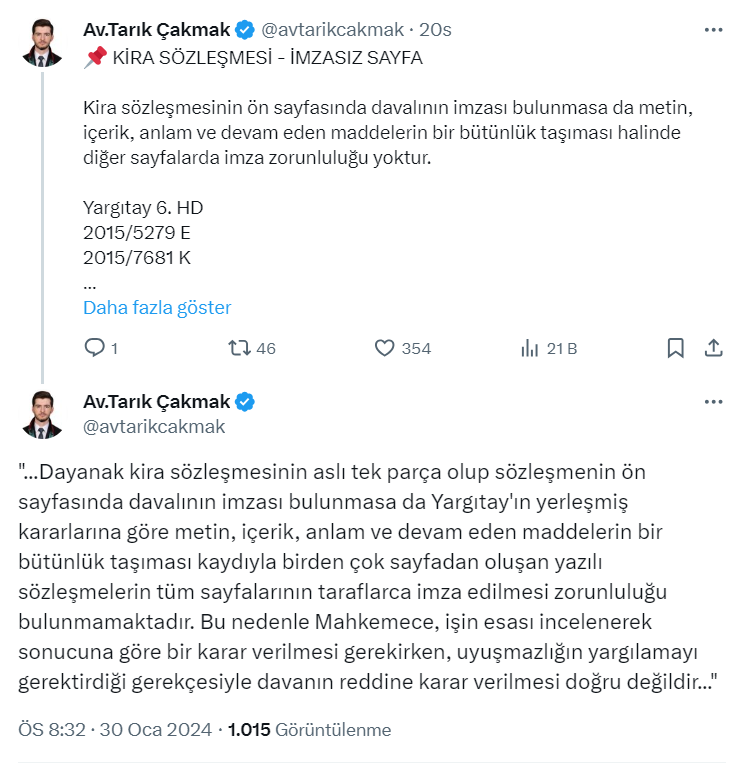 Avukat Tarık Çakmak paylaşımında kira sözleşmesinin ön sayfasında davalının imzası bulunmasa da metin, içerik, anlam ve devam eden maddelerin bir bütünlük taşıması halinde diğer sayfalarda imza zorunluluğu olmadığını belirtti.