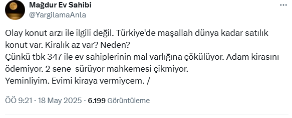 Seslerini sosyal medyadan duyurmaya çalışan binlerce ev sahibi ''TBK 347 ile ev sahiplerinin mal varlığına çökülüyor. Adam kirasını ödemiyor. 2 sene sürüyor mahkemesi çıkmıyor.'' diyerek, evlerini kiraya vermek istemediğini dile getirdi.