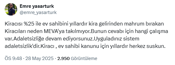 Emre Yasartürk isimli ev sahibi, sosyal medya hesabı X'ten, 'Kiracısı yüzde 25 ile ev sahibini yıllardır kira gelirine mahrum bırakan kiracılar neden MEVA'YA takılmıyor' diye sordu.