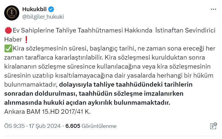 5 bin 779 takipçili Hukukbil isimli kullanıcı resmi X hesabı https://twitter.com/bilgiler_hukuki üzerinden pek çok kişinin gündeminde yer alan tahliye taahhütnamesi ile ilgili bir paylaşım yaptı. Hukukbil paylaşımında "Ev sahiplerine tahliye taahhütnamesi hakkında istinaftan sevindirici haber" ifadelerini kullanarak şunları kaydetti: "Kira sözleşmesinin süresi, başlangıç tarihi, ne zaman sona ereceği her zaman taraflarca kararlaştırılabilir. Kira sözleşmesi kurulduktan sonra kiralananın sözleşme süresince kullanılacağına veya kira sözleşmesinin süresinin uzatılıp kısaltılamayacağına dair yasalarda herhangi bir hüküm bulunmamaktadır, dolayısıyla tahliye taahhüdündeki tarihlerin sonradan doldurulması, taahhüdün sözleşme imzalanırken alınmasında hukuki açıdan aykırılık bulunmamaktadır."