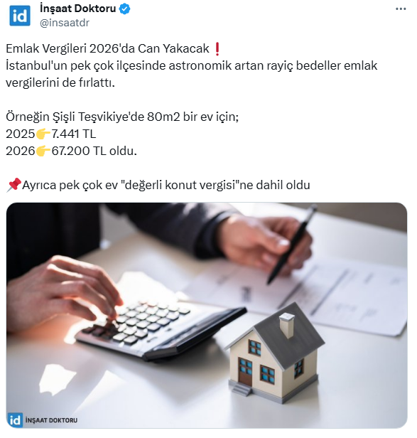 İnşaat piyasasına dair paylaşımları ile dikkatleri üzerine çeken İnşaat doktoru sosyal medya hesabından 2026 emlak vergilerinin 2026'da can yakacağını söyledi.