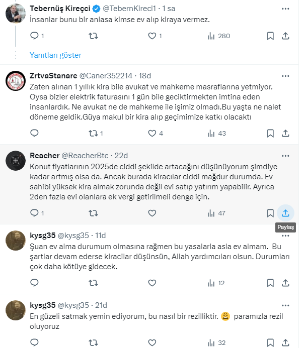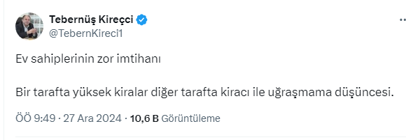 Kireçci, ev sahiplerinin içinde bulunduğu durumu şöyle özetledi: ''Bir tarafta yüksek kiralar diğer tarafta kiracı ile uğraşmama düşüncesi.'' dedi. İşte Kireçci'nin o paylaşımı ve gelen yorumlar...